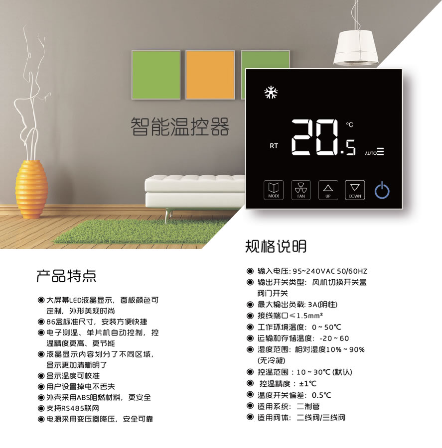 系统由联网型温控器、被控设备(包括VRV中央空调、VAV风机盘管、电动水阀)、温控器网关及温控器联网控制软件组成。采用计算机网络技术与自动化控制技术,对所有末端温控器进行全面的联网监控与管理,它提供直观、简洁、图形化的人机界面,能够实时监控各房间的温度、风速、阀门等状态,实现定时启停温控器,远程设定房间温度,制定不同的控制策略,从而实现最大程度的节约能耗,确保所有设备处于安全、高效、节能的状态。